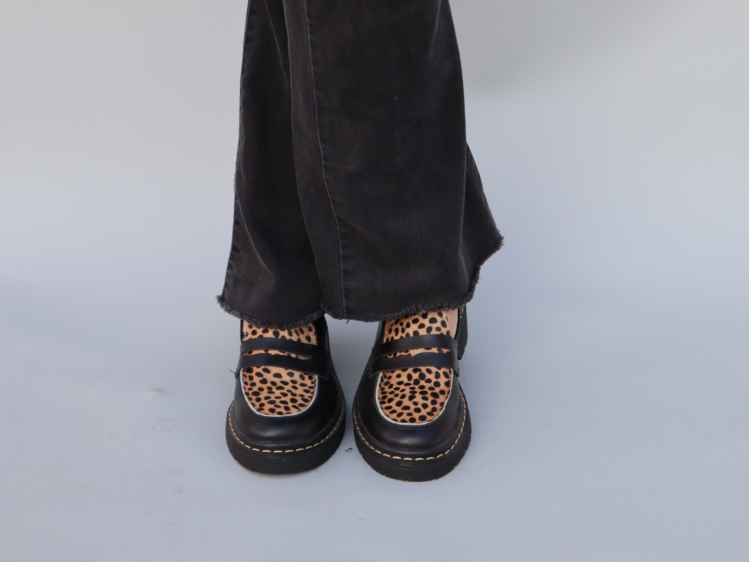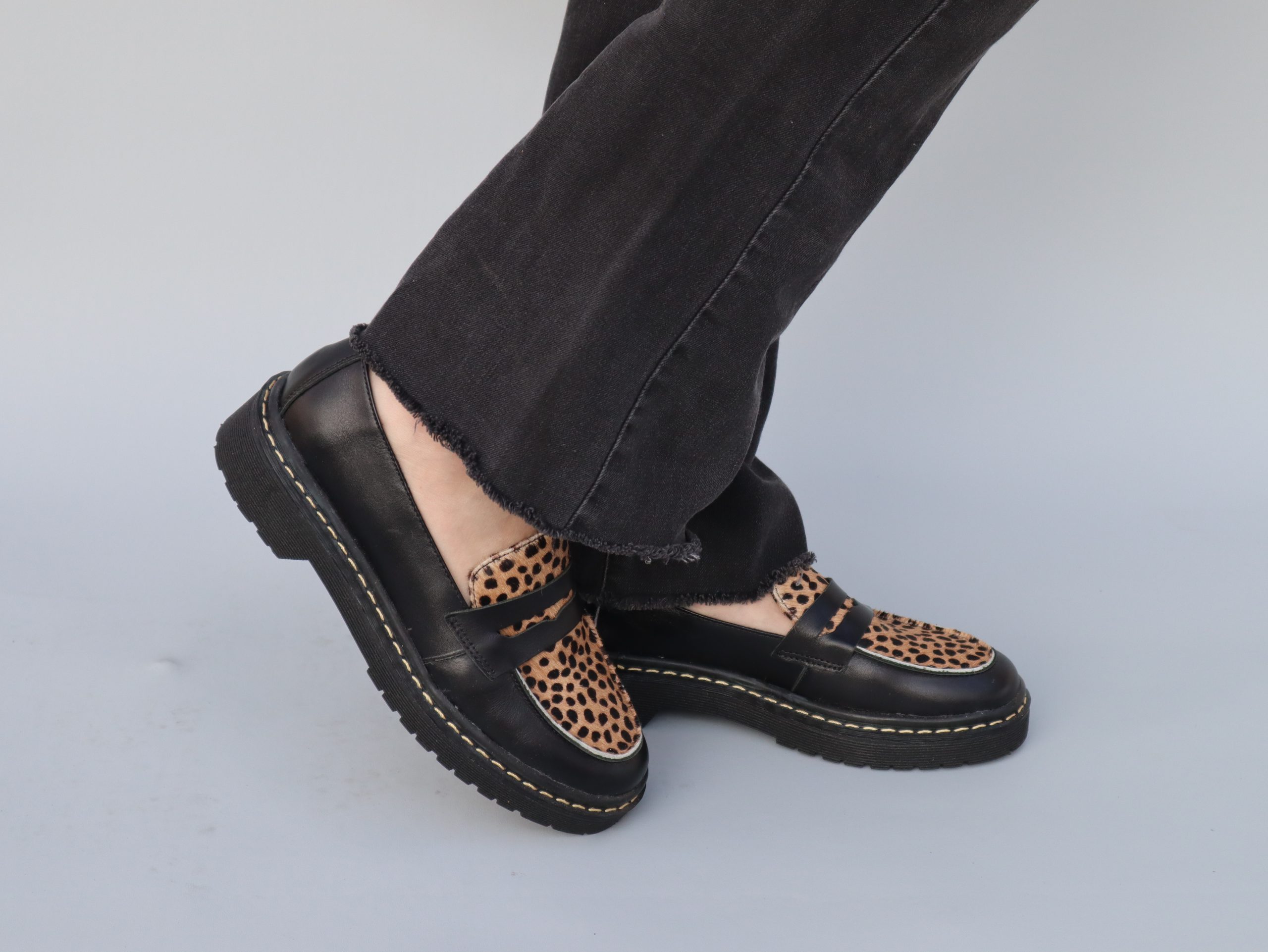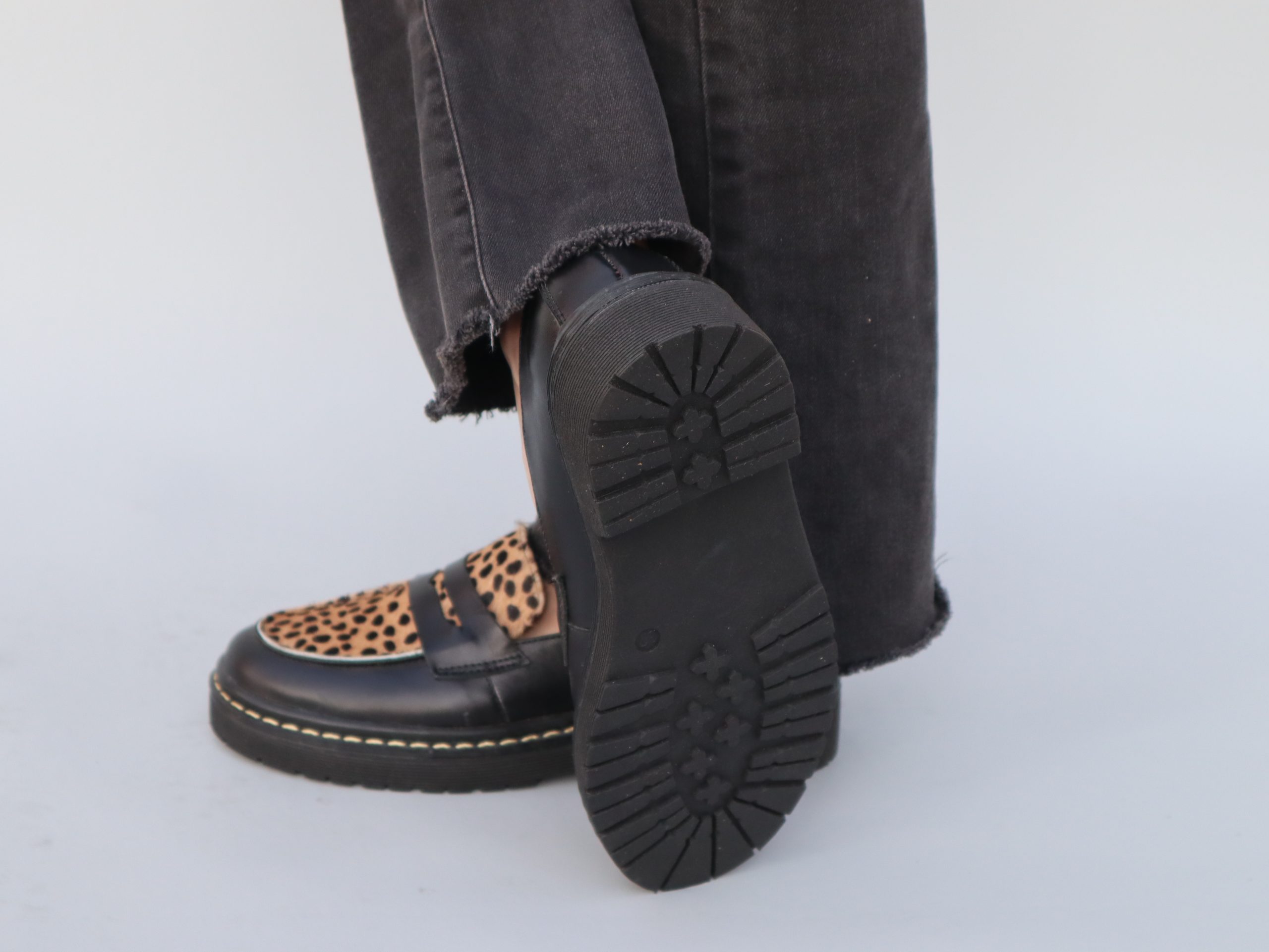 El Moccasin Mocca Negro con detalle en animal print es la mezcla perfecta entre lo clásico y lo audaz.