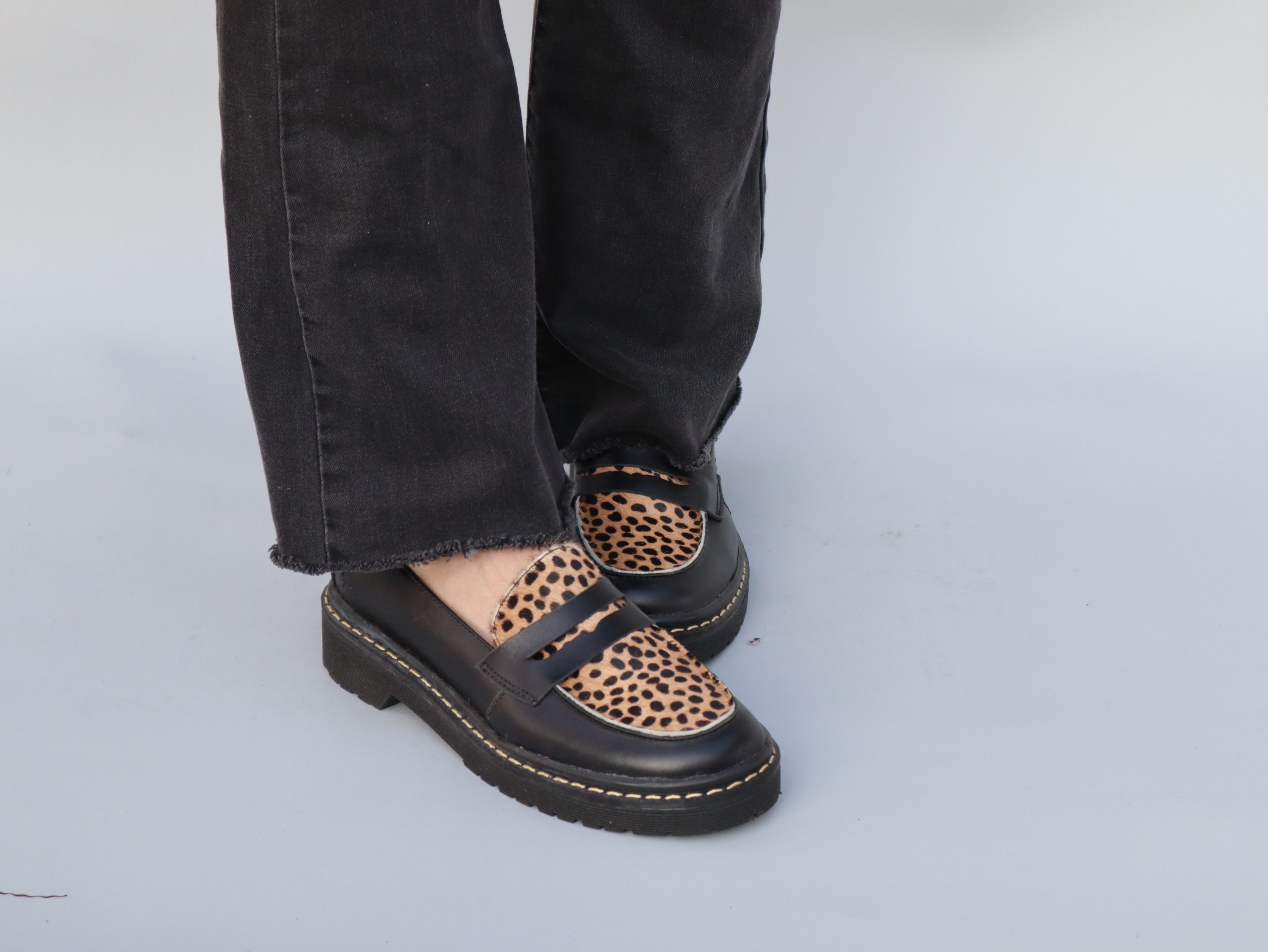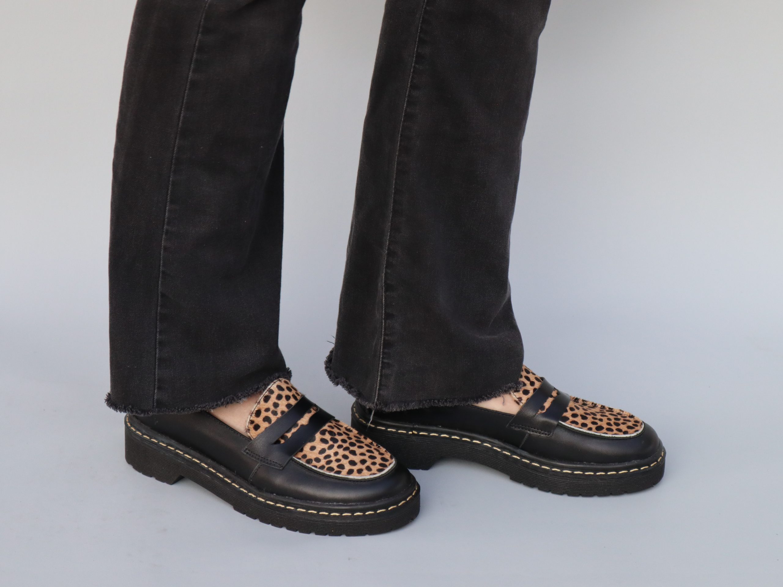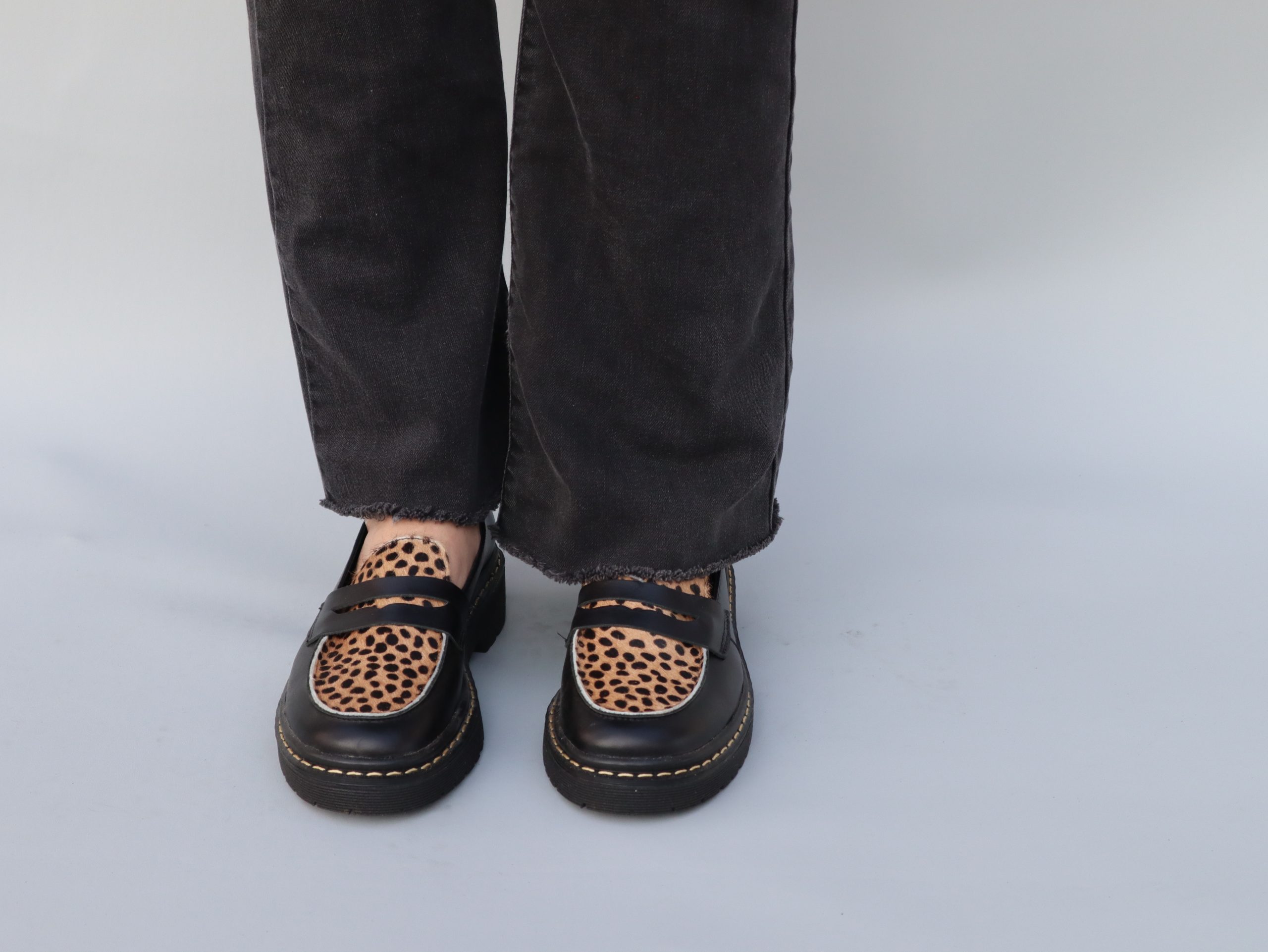 El Moccasin Mocca Negro con detalle en animal print es la mezcla perfecta entre lo clásico y lo audaz.